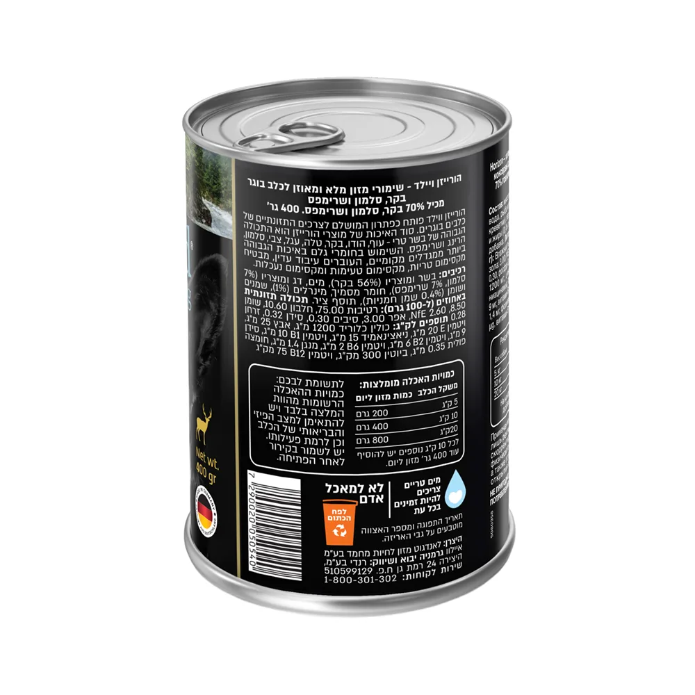 הורייזן שימורי מזון מלא ומאוזן לכלב בוגר –בקר, סלמון ושרימפס. 400 גר׳